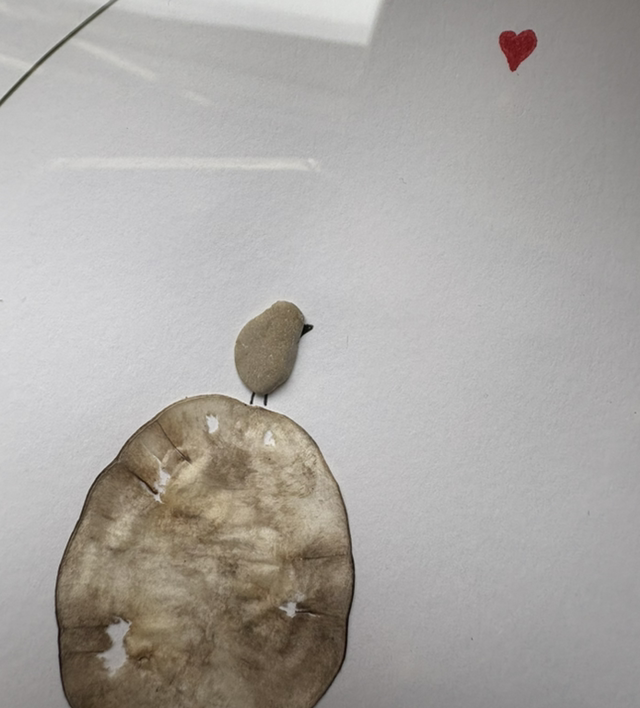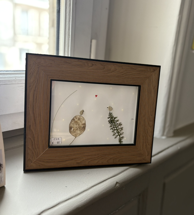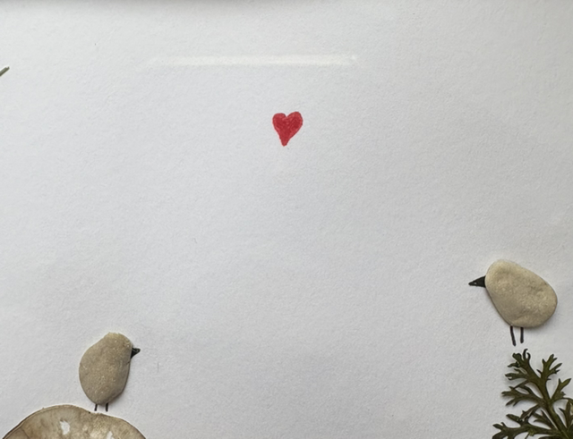 Légèreté et tendresse s’invitent dans ce cadre lumineux où deux oiseaux semblent échanger un doux secret sous un petit cœur rouge. Réalisée à partir de galets, de feuillages et d’éléments naturels soigneusement choisis, cette création évoque la simplicité d’un moment partagé.